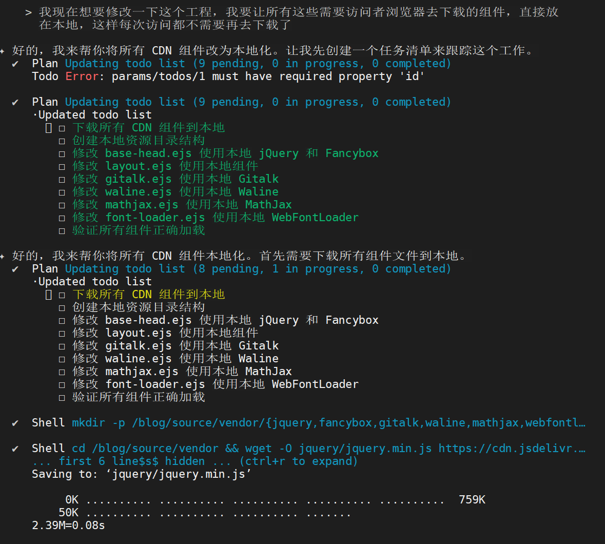 > 我现在想要修改一下这个工程,我要让所有这些需要访问者浏览器去下载的组件,直接放在本地,这样每次访问都不需要再去下载了