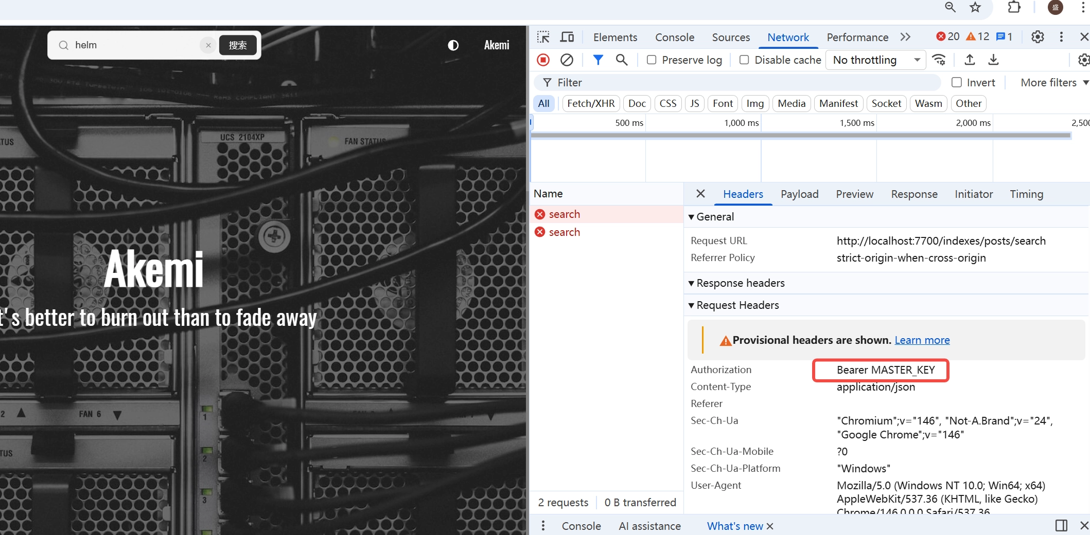 meilisearch 不使用 bearer auth,而是使用特殊请求头 X-MEILI-API-KEY(全大写)